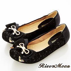 River&Moon璀璨亮鑽朵結蕾絲豆豆軟底包鞋*名媛黑 台製精品通勤鞋款 豆豆舒適鞋底舒適透氣內裡 鬆緊帶飾口 柔軟彎曲芭蕾鞋款包腳舒適好走