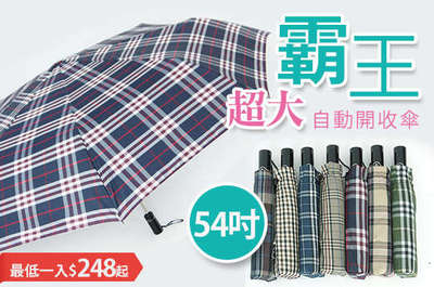 遇到下大雨,你需要一把巨無霸的傘!【霸王超大54吋自動開收雨傘】超大傘面,增加遮雨面積,雨天不再害怕濕答答!每入只要248元起,即可享有霸王超大54吋自動開收雨傘〈一入/二入/四入/八入,款式可選:拿鐵棕/米蘭格/深藍格/英倫格/丈青藍/卡其格/抹綠格/深紫格〉