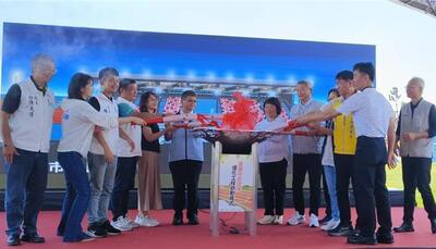 嘉義市長黃敏惠、教育部體育署副署長房瑞文等官員及議員22日啟動田徑場優化工程。(廖素慧攝)