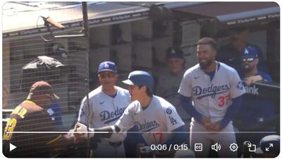 大谷翔平開轟後和教士球迷擊掌。(圖/翻攝自Hyeseong Kim Muse 김혜성 X)25日道奇作客教士,9局上大谷翔平炸裂本季第45轟,開轟後竟還發生小插曲,這場比賽坐在道奇休息室旁邊的1位教士球迷整場都在干擾大谷,不過在大谷開轟回到休息室之前,竟主動找向這名球迷並和他擊掌,連那名球迷自己都嚇了一跳。窗框矽利康