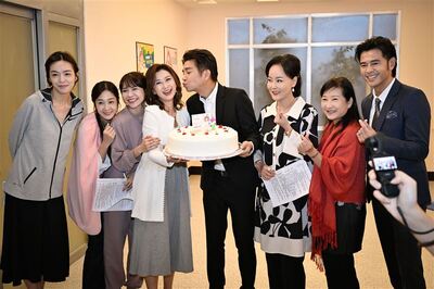 陳珮騏(左四)在《百味人生》棚內慶生。(圖/三立提供)台8女神陳珮騏27日在三立八點台劇《百味人生》棚內慶祝48歲生日,吹蠟燭許願時,當她說到第三個願望,劇中老公謝承均打趣問:「怎麼沒有許男人的願望?」陳珮騏立刻笑回:「我有你就夠了!」