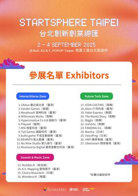 2025 StartSphere Taipei 參展商一覽表。(圖/主辦單位提供)本年度以「Play Beyond Limits」為主題,策劃了不可錯過的「V-I-S-T-A」五大亮點論壇:《Vision Dialogue影視產業的數位遠景》論壇,Netflix《瘋狂獨角獸》導演 Nottapon 首度來台,攜手韓國 GIA 基金、The Manta Story 與台灣 瀚草文創,共談影視產業的數位轉型契機。《InteractiVerse:遊戲與科技的未來互動》論壇,《Guitar Hero 吉他英雄》共同創辦人 Kai Huang,將與矽谷投資人、台灣、越南、泰國的遊戲代表同台,深入剖析跨國遊戲合作與互動科技新模式。《Sounds, Music & Idol聲影製造》論壇結合 K-POP、Disney 團隊與 AI 音樂新創,探討偶像經濟與 AI 音樂革命,揭開新世代音樂市場藍海。《Travel Meets Tech展會×旅遊×科技》論壇由泰國Techsauce、日本IVS、台灣 RTM領銜,剖析亞洲旅遊與會展科技的全新商模與市場洞察。《Audience Connect: Startup Pitch & VC Networking新創展演與創投交流》攜手10家國內外新創現場展演及AppWorks、VinaCapital、日本 DLE 等重量級投資人,搭建跨國投資與交流的最佳舞台。