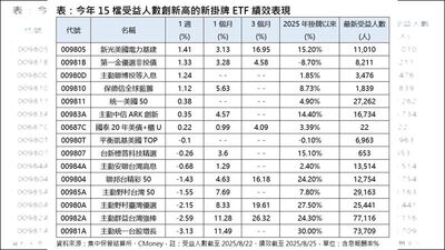 今年以來27檔新掛牌主、被動ETF中,根據CMoney統計,其中有15檔截至8/22最新受益人數創掛牌以來新高,從類型來看,主動式國內股票型有6檔出線、跨國投資股票型也有4檔進榜;投資主題來看,除主動式ETF鎖定台股外,被動型ETF主要集中美股、科技或電力產業型居多,券商主管表示,受到上周美台兩地股市遭AI泡沫論影響出現一波下跌,反而吸引ETF逢低買盤進場,推升新掛牌熱門ETF受益人數創新高;另外,上週高人氣的新掛牌ETF,近期股價表現不俗,觀察近1週績效表現,包括新光美國電力基建(009805)、第一金優選非投等債(00981B)、主動聯博投等入息(00980D)以及保德信全球藍籌(009810)等4檔,單週績效皆漲逾1%以上,至於統一美國50(009811)、主動中信ARK創新(00983A)兩檔,近1週績效也維持正報酬表現。