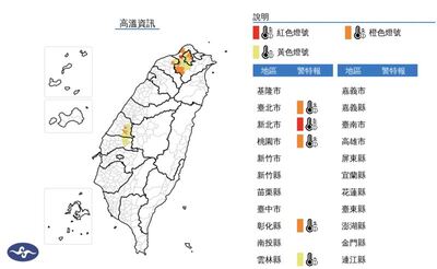 5縣市高溫,氣象署提醒民眾慎防熱傷害。(圖/中央氣象署)各地天氣晴朗炎熱,中央氣象署發布5縣市高溫資訊,今(30)日白天新北市為紅色燈號,有連續出現38度極端高溫的機率;臺北市、桃園市、彰化縣為橙色燈號;雲林縣為黃色燈號,氣溫達36度以上。