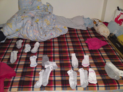 我說 我說前幾天 溼淋淋沒太陽 怎麼曬鹹魚 = = 還好 小寶的聰明 加上 我的才智沒太陽 就用 除濕機啊~~在出門的前一刻 把襪子平鋪在床上 除濕機 開著 ~~烘烘烘烘 ~~~下班回家 鹹魚也乾 ...