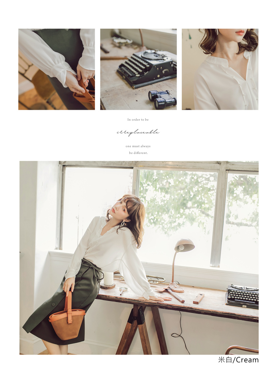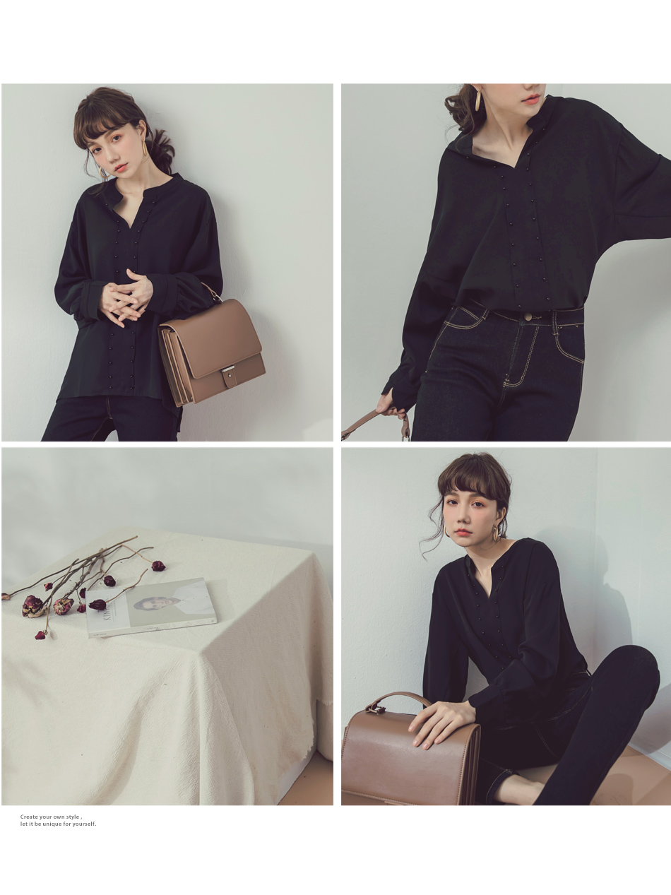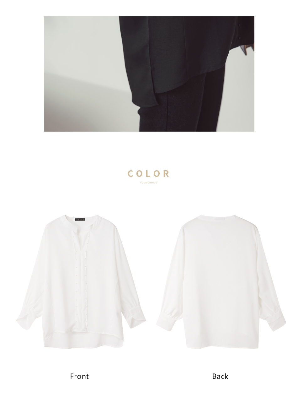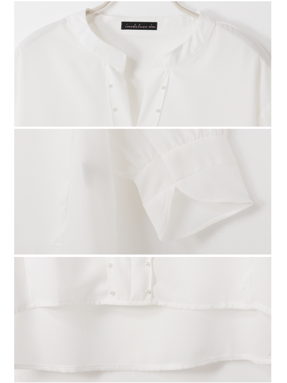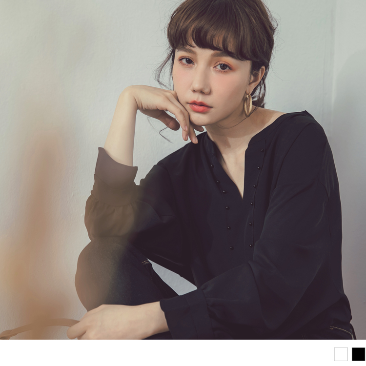 【2019年最新款】胸前珠飾半開襟前短後長雪紡上衣 省錢