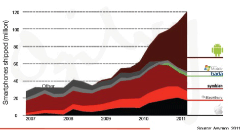 圖一:根據統計,全球至2011年為止,累積出貨了1億2000萬支的智慧型手機。