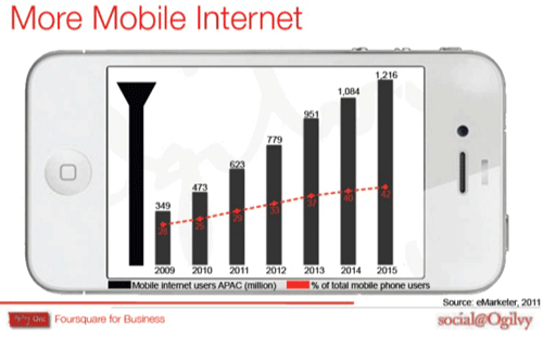 圖二:根據統計,到2015年為止,亞太區的手機上網人口將達到12億人
