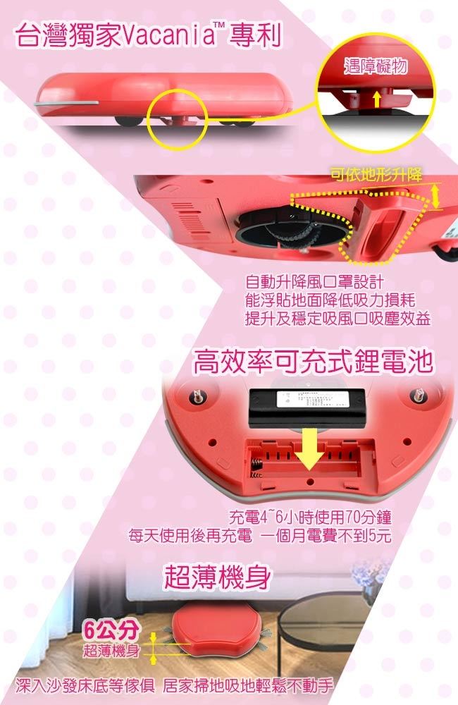 ◆台灣獨家VacaniaTM專利升降吸風口設計,行走中隨環境升降,能更貼近地面,吸力效益提昇及穩定