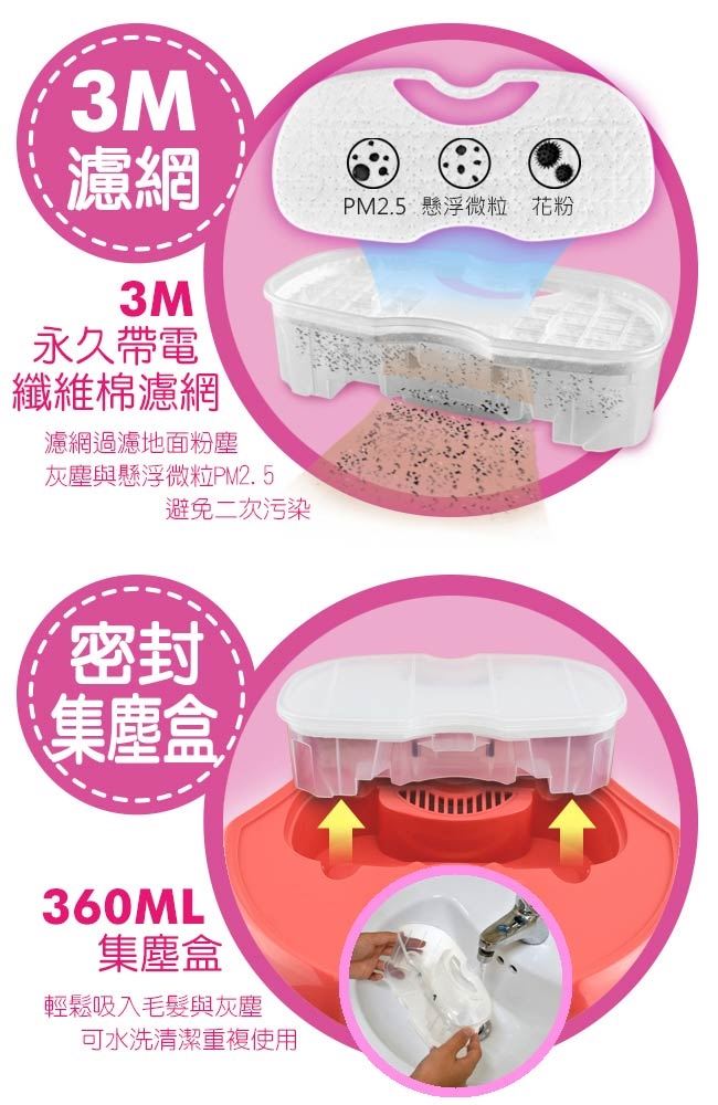 掃地/吸地/乾擦三合一,一鍵操作清潔溜溜!搭配旋轉擦地盤,掃+吸+擦,3M永久帶電纖維棉濾網可過濾,高效可充式鋰電好方便