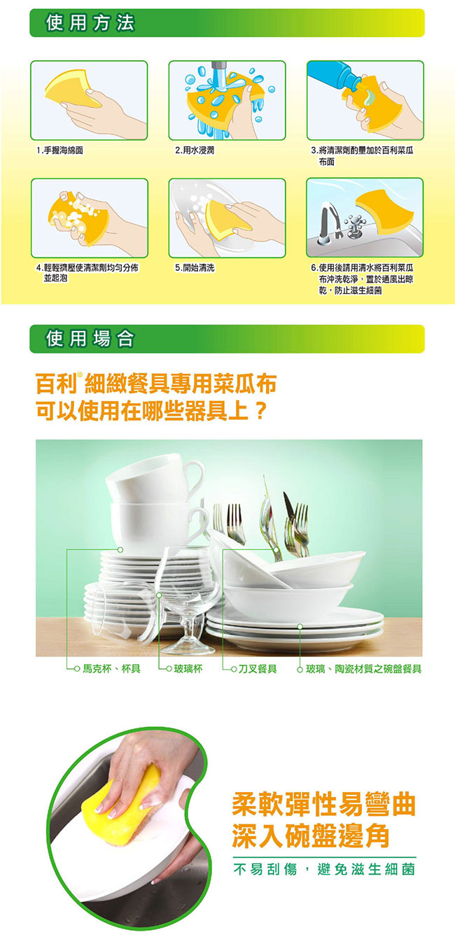 ◆整體菜瓜布柔軟彈性可隨器皿形狀彎曲,深入餐具邊邊角角與茶杯底部,可輕鬆清潔污垢與茶垢