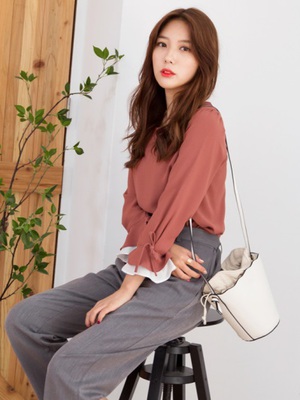 【好康活動】雙層配色縮口綁帶喇叭袖素色雪紡上衣-送禮推薦