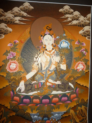 這是我在拉薩畫店購得的白度母唐卡,畫工非常精緻。傳統西藏唐卡的裱褙和我們見的國畫不同,畫師邊教我摺錦緞邊說:「這是裱褙是代表佛殿的正面。佛像要安座在佛殿裡,表示對祂的尊敬。」西藏唐卡的佛畫可以說是工筆...