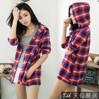 【天母嚴選】暖暖特賣-連帽格紋毛料調袖長版襯衫(共它- 口語表達