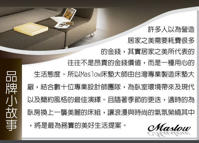 Maslow冬夏兩用硬式彈簧床墊結合最時尚流行的掀床組組合,採用2.3釐米線徑連結式彈簧設計,平整支撐脊椎,特別適合發育中孩童、愛好硬式床墊族群及骨質脆弱的銀髮族群,在睡眠之中得到最完善的保護。而一面涼爽蓆面(夏天使用)、一面為印花布設計(冬天使用),透氣感比一般床墊佳,更可以依照季節的變化,而有不同的選擇,一床抵兩床,讓您有雙種睡眠選擇;而掀床的設計可大量的收納您冬夏季交替的衣物及棉被,不用擔心到處堆疊的收納櫃所造成空間的浪費;且專利設計的氣壓棒、不僅開關容易更經過萬次的壓力測試,品質有保障;床角邊緣採用圓邊弧度設計,不用擔心孩童擦撞的危險,是個收納方便及安全的最佳床組。