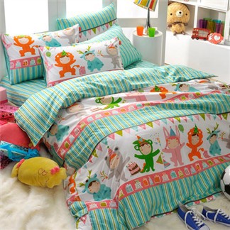 .視覺:整組寢具的被套及枕頭套為AB版製作,A版-俏皮動物裝扮設計,B版-彩漾繽紛線條設計。高成本科技印染,呈現絕佳的艷度,呈現出立體的真實的美感。