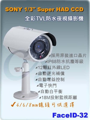 商品訊息描述: FACEID ID-32 SONY 1/3吋 CCD 全彩540TVL防水夜視攝影機