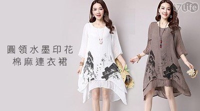 平均每件最低只要465元起(含運)即可購得圓領水墨印花棉麻連衣裙任選1件/2件/4件,顏色:白色/褐色,多尺寸任選?