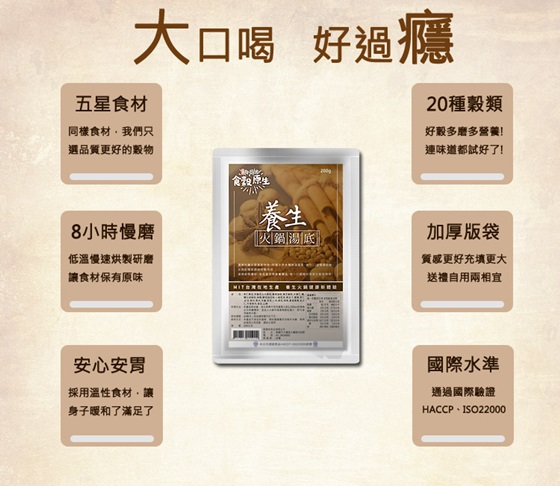 ●全台第一款以12道原穀物研磨而成,吃火鍋也能很養生