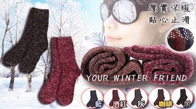 平均每雙最低只要55元起即可購得台灣製厚底止滑保暖安哥拉毛襪1雙/3雙/5雙/12雙/24雙,顏色:黑色/酒紅色/藍色/灰色/咖啡色。