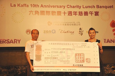 【2014年9月25日,台北訊】 擁有包括Chatime日出茶太、La Kaffa咖啡輕食、銀座杏子日式豬排與Bak Code烘焙密碼等餐飲品牌的六角國際,走過十年裡程碑之際,特以感恩公益回饋社會,在現場捐贈五十萬元台幣給聯合勸募協會,做為集團公益活動的啟程,未來也將會持續與聯合勸募協會長期合作,協助改善弱勢青少年的教育問題,推出「拾起幸福的微笑」活動:門市公益捐款活動、提供門市職缺給弱勢青少年並輔導其職涯規劃。所有捐款將投注在聯合勸募協會「孩有機會」兒少教育支援服務。