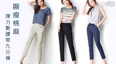 CP值超高顯瘦棉麻彈力繫腰帶九分褲-本周折扣