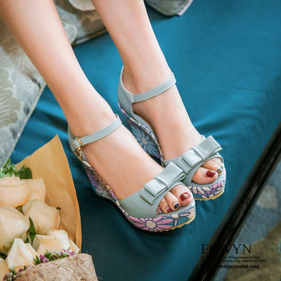 EOWYN.甜美印花蝴蝶結一字釦環厚底坡跟楔形涼鞋EMD04795-67-3色-34-39碼現貨+預購 - 賣家強檔