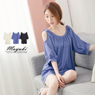 momo購物台,momo購物網:【MAYUKI】綁結露肩抓皺雪紡上衣-S.M