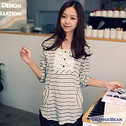 OB嚴選【出遊特賣會】圓領反褶袖浪漫緹花條紋棉質上衣』