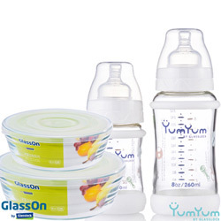 Glasslock YumYum 嬰幼哺育4件組 - 安全防摔玻璃奶瓶+微波盒