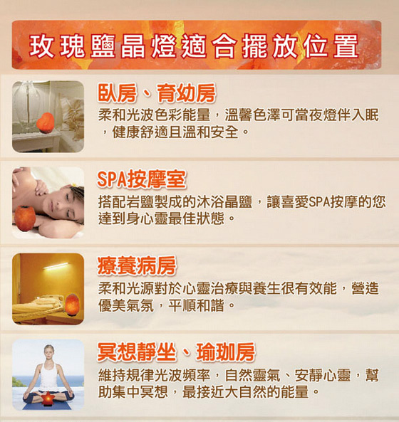 產自喜馬拉雅山與烏拉圭的天然岩礦,蘊藏多種有益元素,鹽晶燈能夠吸收屋內多餘濕氣,調節溫度,讓環境更加清新舒適,坐擁健康豐盛人生。專人配送到府!
