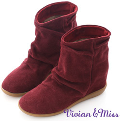 Vivian&miss 極簡當道~素面抓皺全真皮內增高短靴(紅)