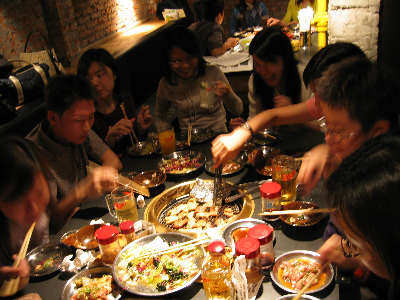 八點一到,一位高帥的工作人員拿起喇叭開始炒氣氛,首先是一一介紹今晚有哪些客人是因為慶祝哪些特別的事件而來乾杯吃飯,有的人是升官—經理升協理,有的人是找了三年工作終於找到開始上班了,有的人是追了三年餘的女人終於追到手了,只有我們這桌有壽星,有兩個本月的壽星喔,我舉起手來跟大家揮揮手。這時候我的神智已經有點不清楚了,有點擔心還沒開始吃肉就要倒一邊去了!