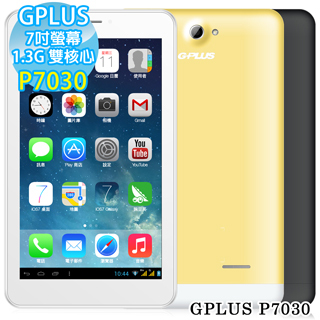 台灣手機品牌大廠GPLUS再度推出入門款7吋PadFone機種,更精緻的外觀設計給搭載更平價的消費價格,不同於其他廠牌單核心處理器,P7030採用 A9架構 1.3Ghz雙核心處理器,搭載了 Mail-400MP顯示晶片,內建 4GB ROM可外接擴充32GB記憶卡,支援WCDMA+GSM雙卡雙待,可WiFi上網也可使用3G網路系統,配備了800萬畫素鏡頭,錄影拍照都一次搞定,台灣品牌7吋手機的最超值選擇。