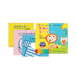 本套書共有三本──《尿尿是什麼?》、《衣服躲貓貓》、《大口吃飯的祕密》,內容是讓新手父母能夠讓幼兒寶寶學會第一次上廁所、自己穿衣服以及吃飯這些日常生活的動作。在爸爸媽媽導引孩子翻閱繪本內容過程中,不知不覺地讓孩子建立這些概念,進而在生活學習上連結而運用。