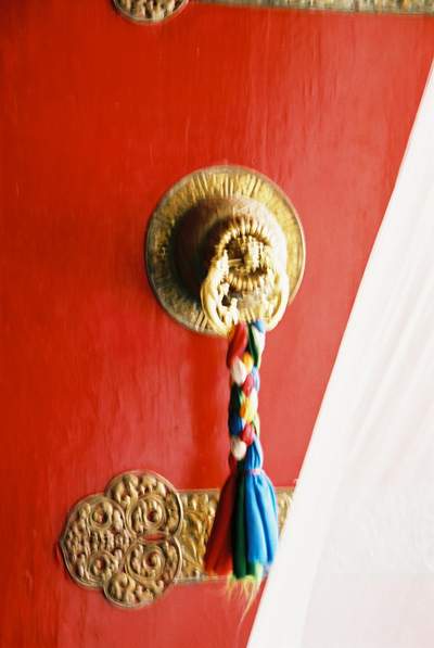 圖片說明:羅布林卡寺院的朱紅色大門,以及五色絲線編織的垂帶。在陽光...