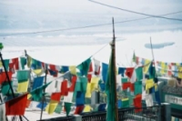 圖片說明:在德里藏人區樓房上空飄揚的風馬旗。旗上印著咒語和祈禱文,風就帶著祝福,吹向一切眾生。