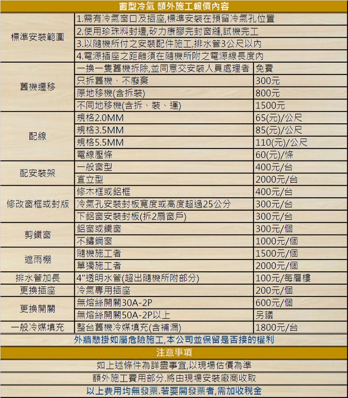 @安裝位置尺寸大於冷氣安裝尺寸,不必再修改窗口 ( 適用窗型 ) 冷氣孔周邊縫隙封填免收費,窗戶、氣窗口如需加封木板,需收費。