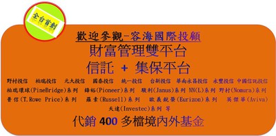 國內首創財富管理信託平台的證券投資顧問公司 第一家以共同基金為投資建議核心的證券投資顧問公司 代銷:國內9家投信:近500檔基金野村、柏瑞、國泰、元大、永豐、統一、台新、華南永昌和中國信託投信 境外基金總代理10個系列:約400多檔基金高盛(Goldman Sachs)、駿利亨德森(Janus Henderson)、柏瑞環球(PineBridge)、普徠仕(T.RowePrice )、羅素(Russell)、野村(Nomura)愛爾蘭、歐義銳榮(Eurizon)、晉達(Ninety One)、荷寶(Robeco)和法盛(Natixis) 容海國際證券投資顧問(股)公司 RoundHigh International Asset Management Co.,Ltd. 一百零七金管投顧新字第零壹捌號 客服信箱:service@roundhigh.com