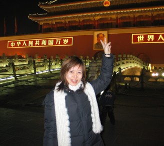 說到傲氣,毛澤東大概是最神氣的!象徵權力的天安門中洞門上,不正高高懸掛著毛主席的超大畫像嗎?咱們幾個女生最後一天吃完晚飯,從飯店步行到天安門廣場看夜景時,心血來潮之際打算趁著夜色拍些搞笑照片,露比胡亂出點子用兩根手指頭戳毛主席鼻孔(不是比2號凍蒜啦),其他人有的給他個下勾拳、有的賞他個大巴掌,就在我們嘻嘻哈哈笑到肚子痛時,在旁巡守的解放軍慢慢聚集在我們後面,不好直接出言制止我們這些台灣遊客繼續拿毛的畫像開玩笑,只好站在不遠處企圖阻礙拍照,讓我們知難而退。