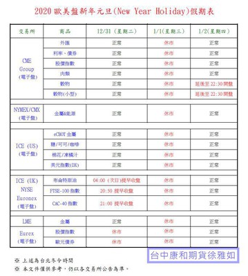 2020 歐美盤新年元旦(New Year Holiday)假期@台中康和期貨徐雅如RuRu線上開戶