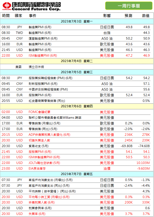 康和期貨-重要數據行事曆2023/07/03@康和期貨國內外期貨選擇權優惠徐雅如#外期海期期貨手續費