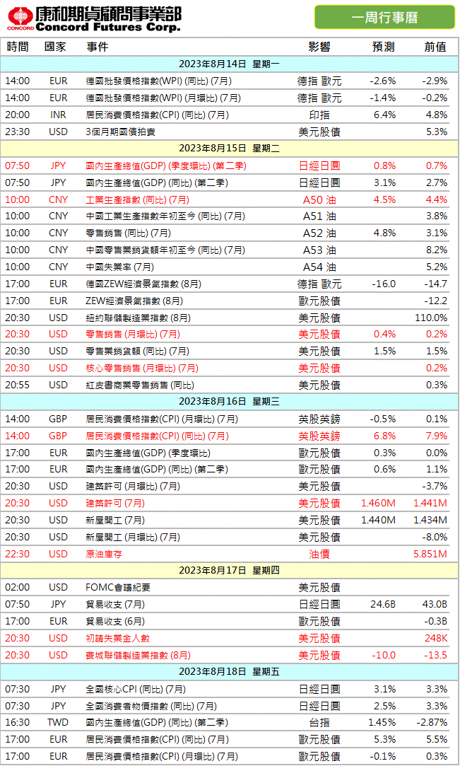 康和期貨-重要數據行事曆20230814@康和期貨國內外期貨選擇權優惠徐雅如#外期海期期貨手續費