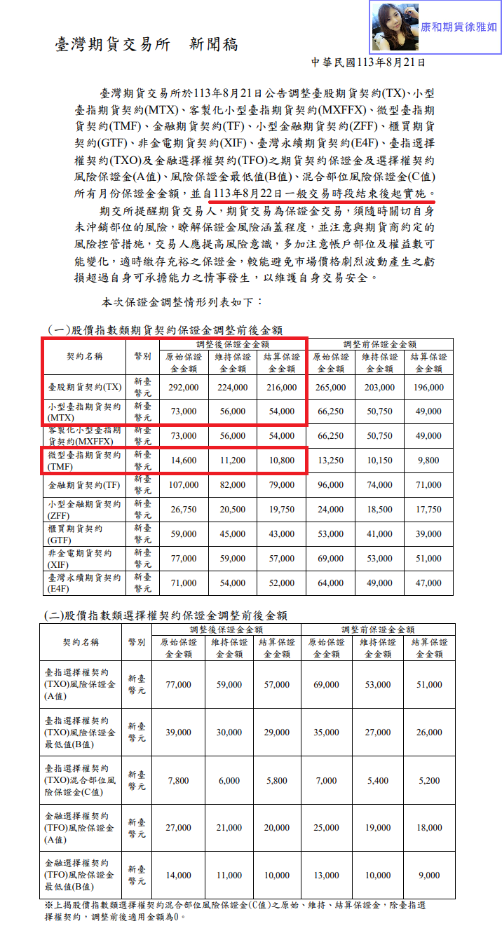 臺灣期貨交易所於113年8月21日公告調整臺股期貨契約(TX)、小型臺指期貨契約(MTX)、客製化小型臺指期貨契約(MXFFX)、微型臺指期貨契約(TMF)、金融期貨契約(TF)、小型金融期貨契約(ZFF)、櫃買期貨契約(GTF)、非金電期貨契約(XIF)、臺灣永續期貨契約(E4F)、臺指選擇權契約(TXO)及金融選擇權契約(TFO)之期貨契約保證金及選擇權契約風險保證金(A值)、風險保證金最低值(B值)、混合部位風險保證金(C值)所有月份保證金金額,並自113年8月22日一般交易時段結束後起實施