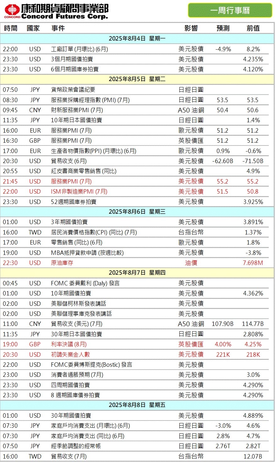 康和期貨-重要數據行事曆202500804-0808@康和期貨國內外期貨選擇權優惠徐雅如