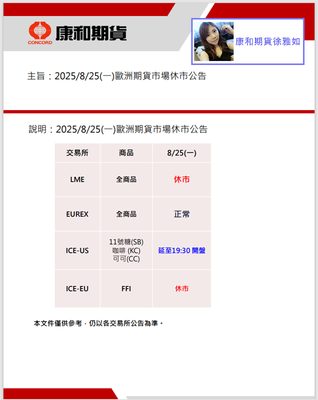 20250825歐洲期貨市場休市公告@康和期貨國內外期貨選擇權優惠徐雅如#外期海期期貨手續費