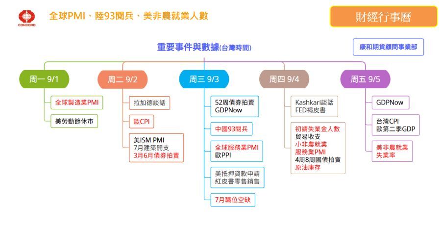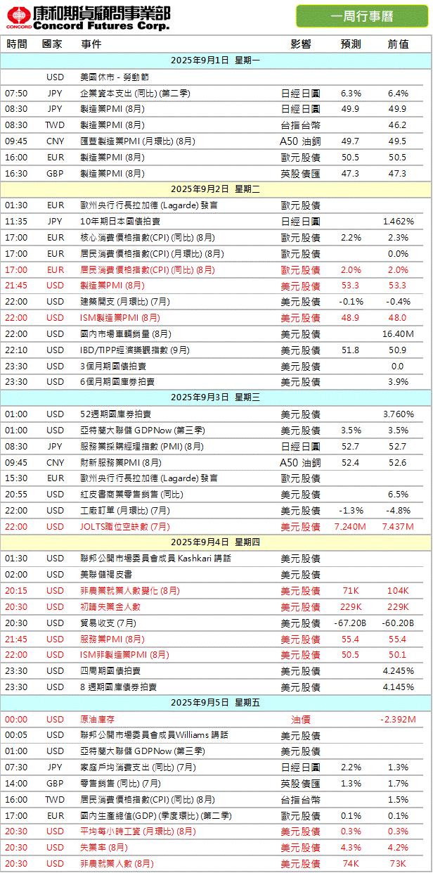 康和期貨-重要數據行事曆20250901-0905