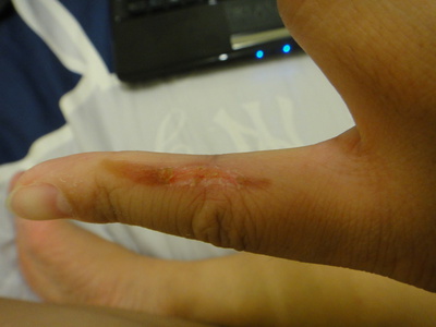 整隻手指頭仍然不停的散熱中,灼熱感遲遲無法消除!(所以大片面積燒燙傷的病人有多痛苦,可以想像!!)