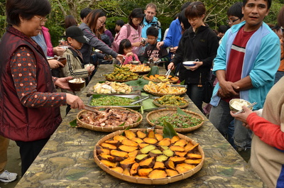 大家迫不及待的拿著早已準備好的餐具(若是沒自備,要用最天然的月桃葉及自己削竹筷),開始裝填食物!!