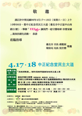 迎接4月22日世界地球日的到來及減少溫室氣體排放、推廣多吃蔬果抗暖化愛地球並增進健康之觀念,臺北市環保局將於99年4月17、18日兩天在中正紀念堂廣場 ,與國內民間宗教團體包括慈濟功德會、法鼓山佛教基金會、清海無上師世界會及人間福報共同舉辦「yes 417 讓我們一起守護地球 珍愛家園 蔬食抗暖化活動」,現場將透過蔬食料理分享、綠色生活展示、親子溫馨活動、抗暖化影片放映及星空守夜祈福等方式,邀請民眾由「心」出發、從「吃」開始,一起節能減碳愛地球!